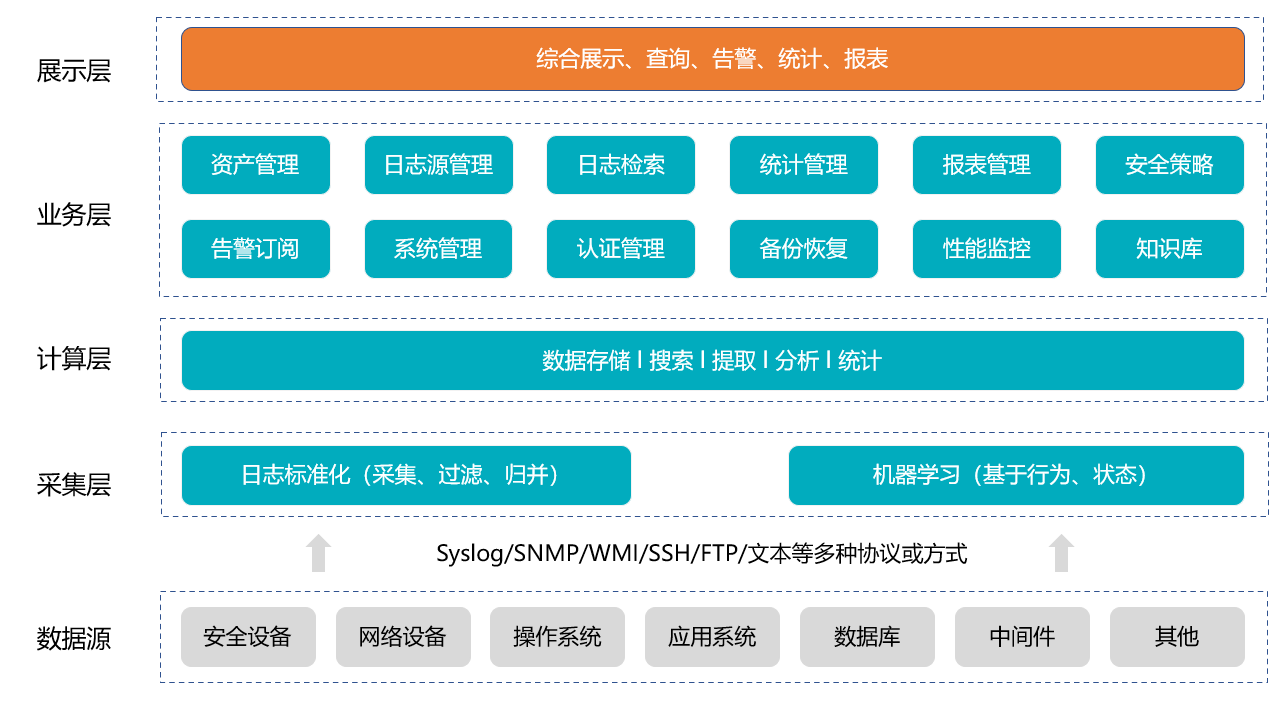 日志采集層利用Syslog、SNMP trap、WMI、FTP 、agent或流量鏡像等方式進(jìn)行日志采集,從數(shù)據(jù)源獲取日志數(shù)據(jù),并根據(jù)規(guī)則進(jìn)行過濾、歸并,同時(shí)把采集過來的非結(jié)構(gòu)化的數(shù)據(jù)轉(zhuǎn)換成結(jié)構(gòu)化的數(shù)據(jù)。同時(shí)基于行為、狀態(tài)等進(jìn)行機(jī)器學(xué)習(xí),提供給計(jì)算層分析。