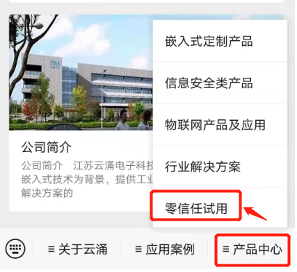 首先關(guān)注云涌科技官方微信公眾號,然后進入【產(chǎn)品中心】菜單,并點擊下拉菜單中的【零信任試用】進入試用頁面,點擊免費試用根據(jù)提示操作即可。