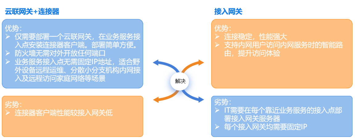 云涌遠(yuǎn)程辦公解決方案支持兩種內(nèi)網(wǎng)訪問模式:基于接入網(wǎng)關(guān)的訪問代理,以及基于云聯(lián)網(wǎng)關(guān)+連接器的內(nèi)網(wǎng)穿透。客戶可以根據(jù)自身IT架構(gòu)及實際需求選擇適合的服務(wù)訪問模式。兩種模式可以同時存在。
