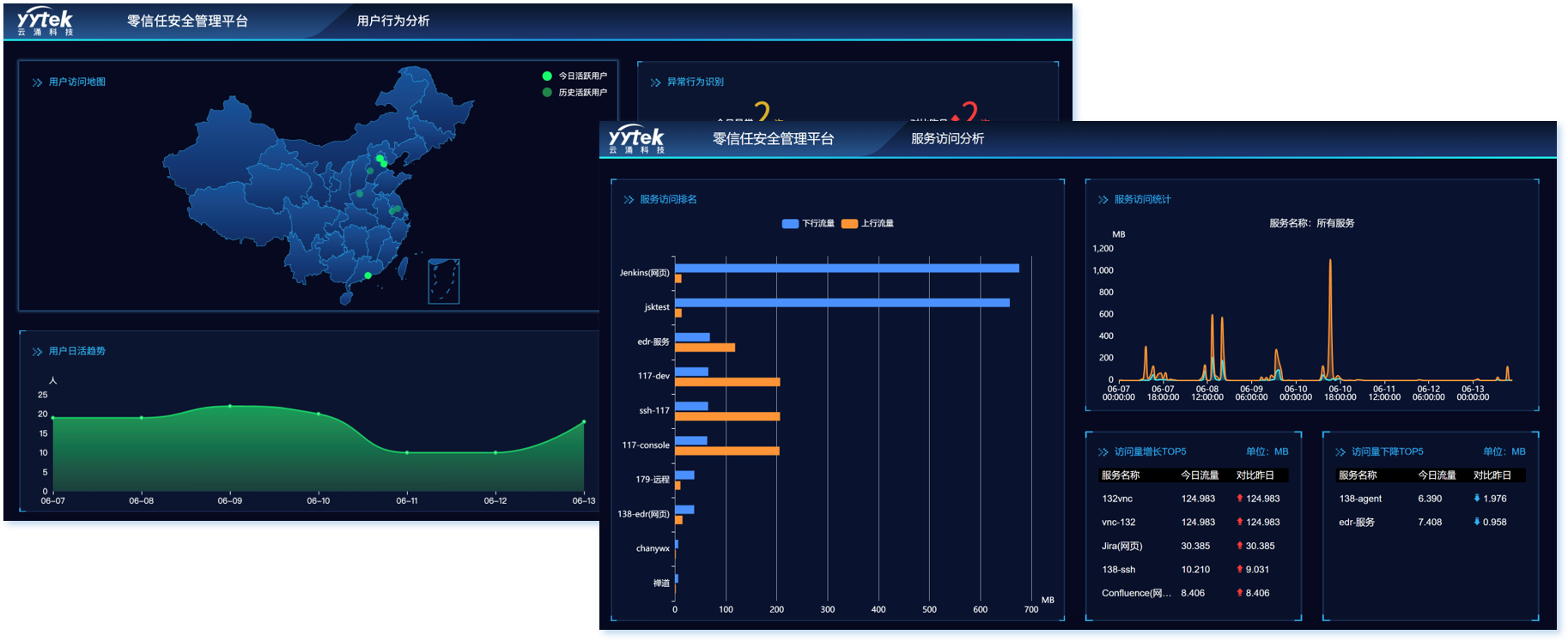 方案提供了用戶使用行為的態(tài)勢分析以及服務(wù)訪問態(tài)勢分析,通過態(tài)勢大屏展示方便日常管理及領(lǐng)導(dǎo)審閱。