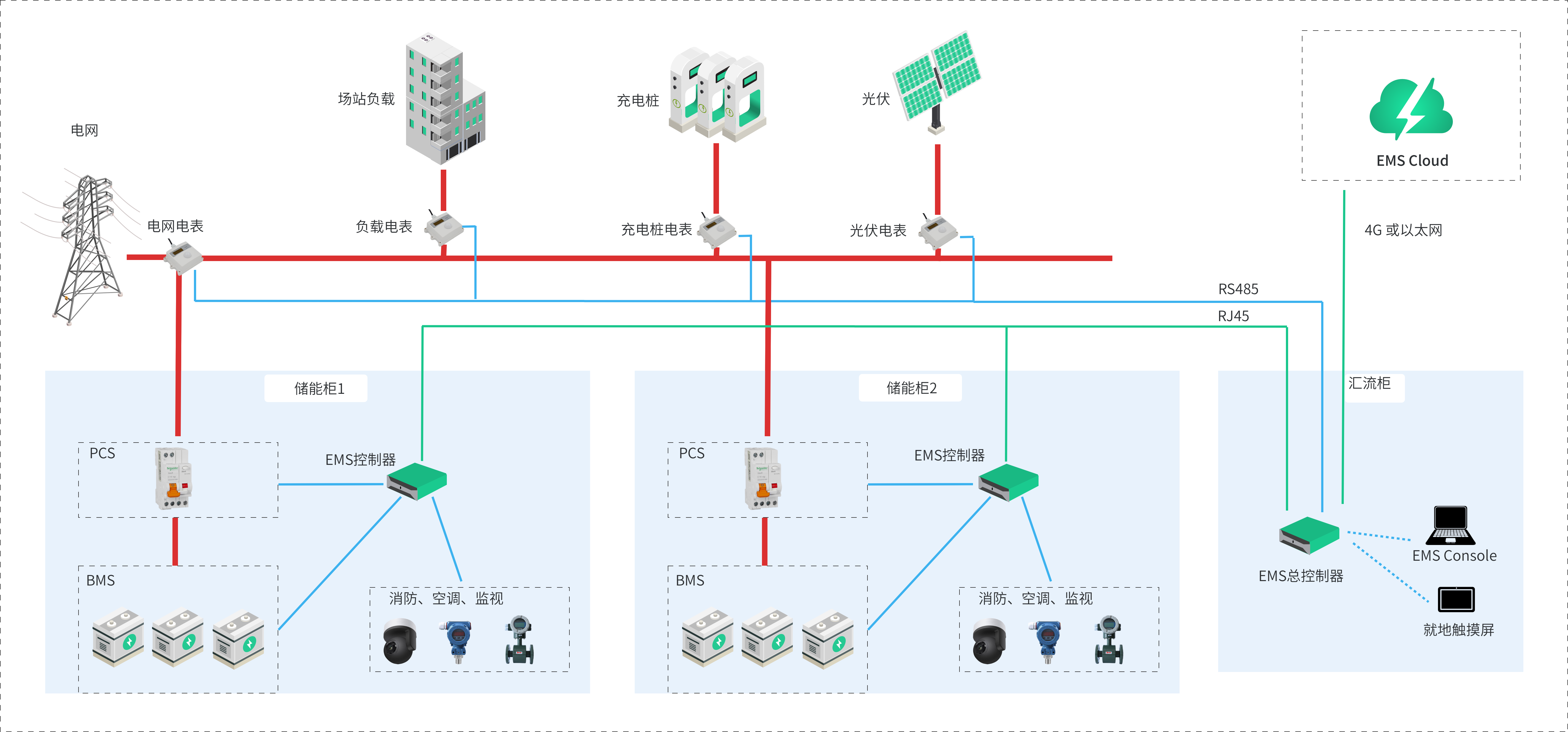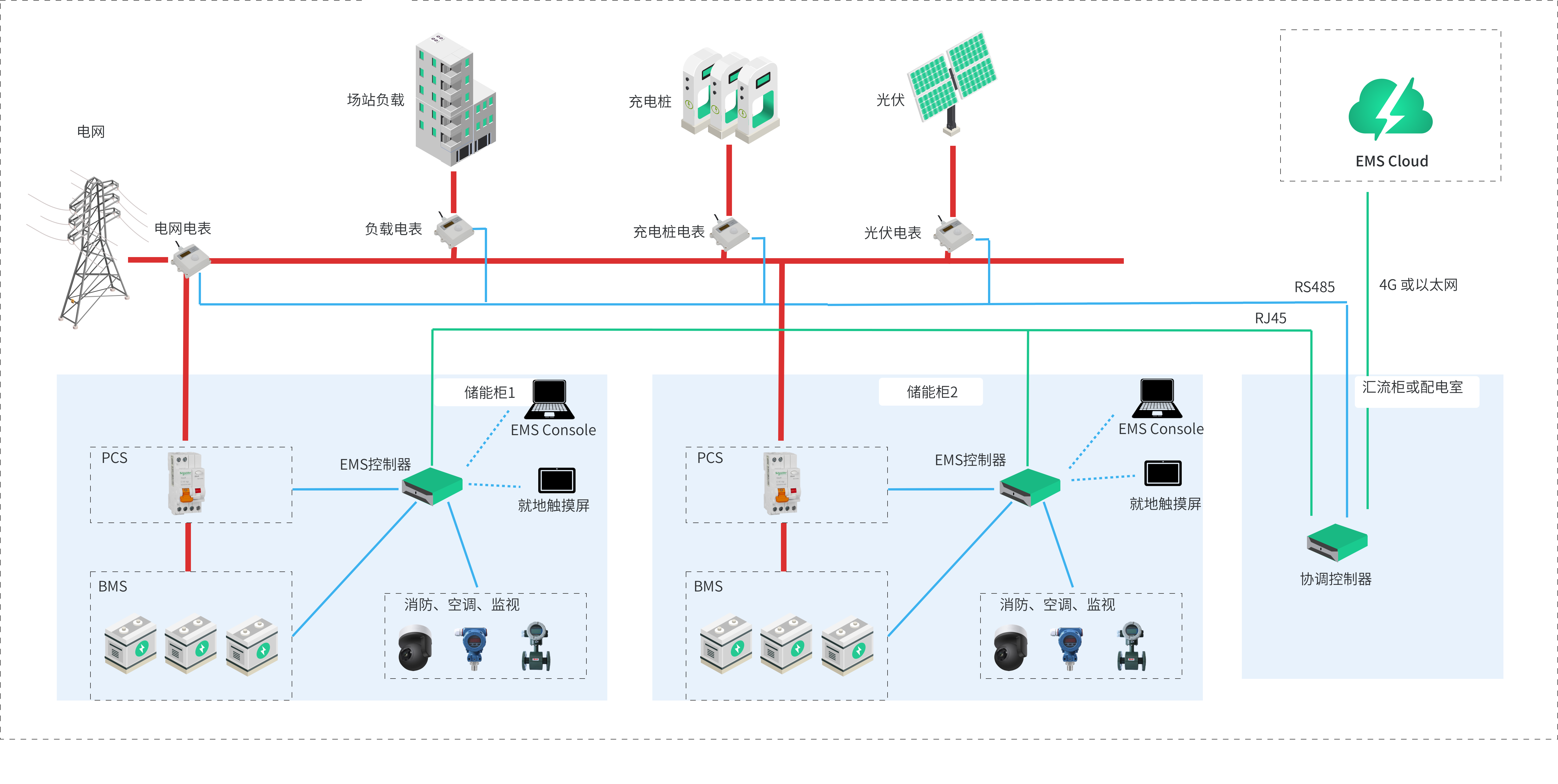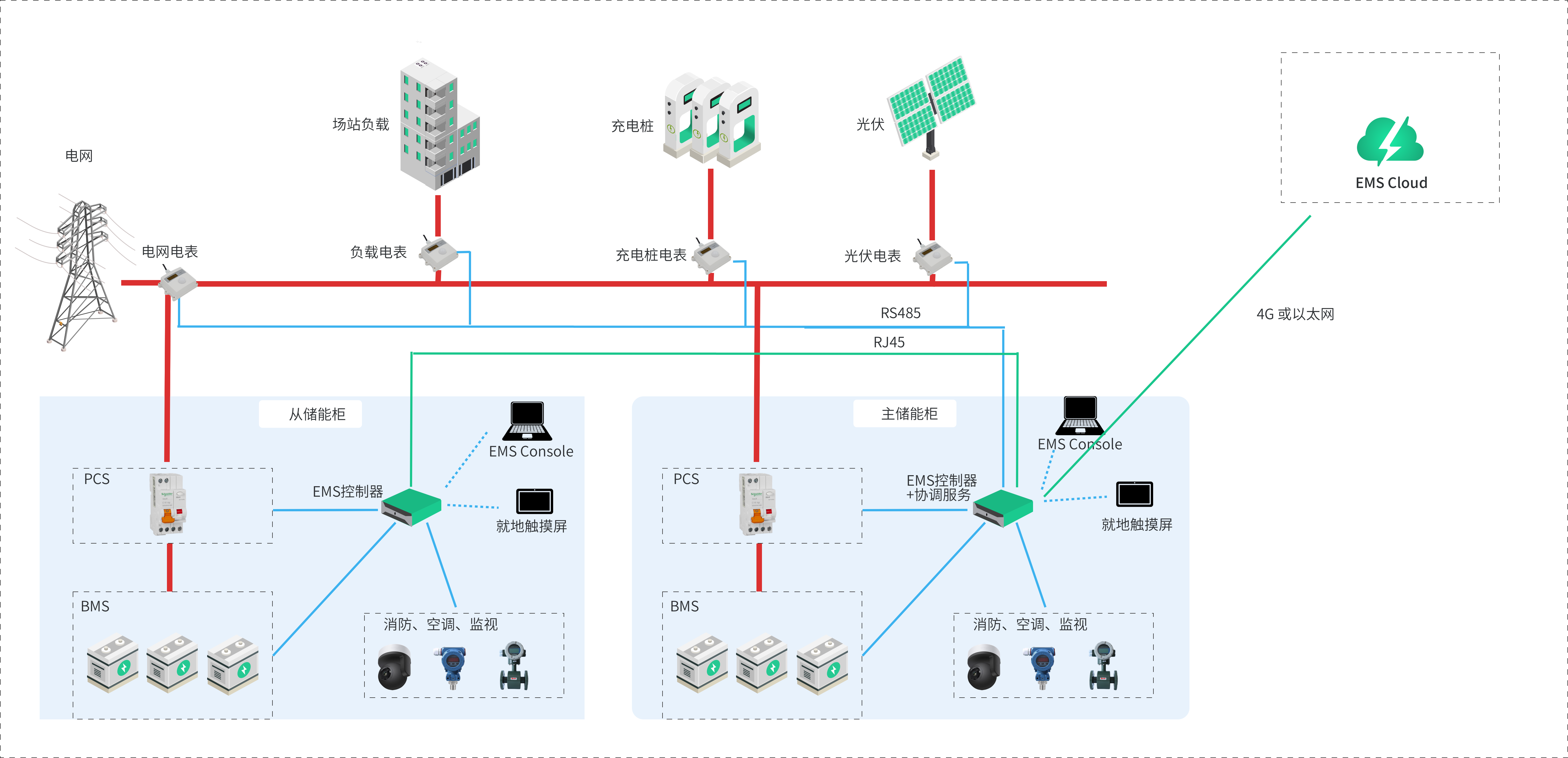 所有柜體內(nèi)只有一個(gè)控制器,并放置于主柜中,主柜EMS控制器通過以太網(wǎng)與所有從柜進(jìn)行通訊交互,從柜中安裝采集或者轉(zhuǎn)換裝置,用于在主柜控制器與從柜各組件設(shè)備之間做數(shù)據(jù)轉(zhuǎn)發(fā)。