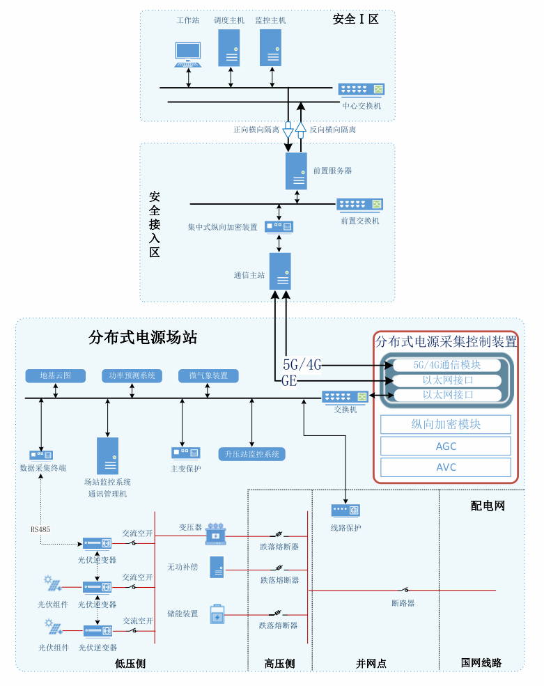 ???該裝置部署于分布式電源場(chǎng)站側(cè),基于無線專用通信網(wǎng)絡(luò)架構(gòu),集成縱向加密單元、無線通信模塊及 AGC/AVC 控制功能,通過電力專用通信通道接入生產(chǎn)控制大區(qū)安全接入?yún)^(qū),與調(diào)度主站建立安全通信鏈路,實(shí)現(xiàn)數(shù)據(jù)傳輸?shù)目煽啃耘c安全性。