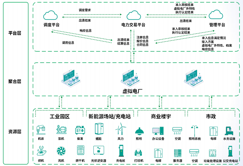 公司是泰州“首家”完成虛擬電廠注冊的企業(yè),虛擬電廠作為一種智慧能源管理系統(tǒng),被稱為能源產(chǎn)業(yè)鏈的“最后一公里“,其核心是將分布式的發(fā)電設(shè)備、儲(chǔ)能系統(tǒng)、電動(dòng)汽車、可調(diào)節(jié)負(fù)荷等資源聚合起來,通過智能算法和通信技術(shù)統(tǒng)一調(diào)度,使其能夠像傳統(tǒng)發(fā)電廠一樣參與電力市場交易或響應(yīng)電網(wǎng)需求,從宏觀層面上,實(shí)現(xiàn)能源的高效利用和電網(wǎng)穩(wěn)定運(yùn)行。