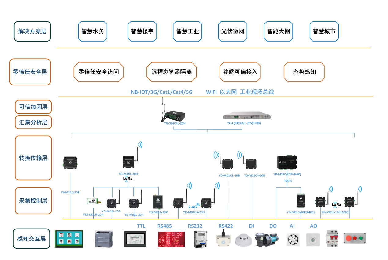 ? ? ? 在采集控制層,使用LORA技術(shù)讓設(shè)備的信號覆蓋更強,同時具備組網(wǎng)功能,解決了采集設(shè)備數(shù)量多、距離遠(yuǎn)、分布廣的問題,針對遠(yuǎn)程控制的需求,提供4G LTE系列數(shù)傳設(shè)備,保證了設(shè)備的云平臺遠(yuǎn)程連接能力,針對部分客戶對通訊的可靠性、實時性的要求,也推出了RS485和本地以太網(wǎng)的通訊組網(wǎng)方案,解決了電磁干擾嚴(yán)重的場景的通訊問題,同時也滿足了部分用戶對數(shù)據(jù)時效性要求高的需求;