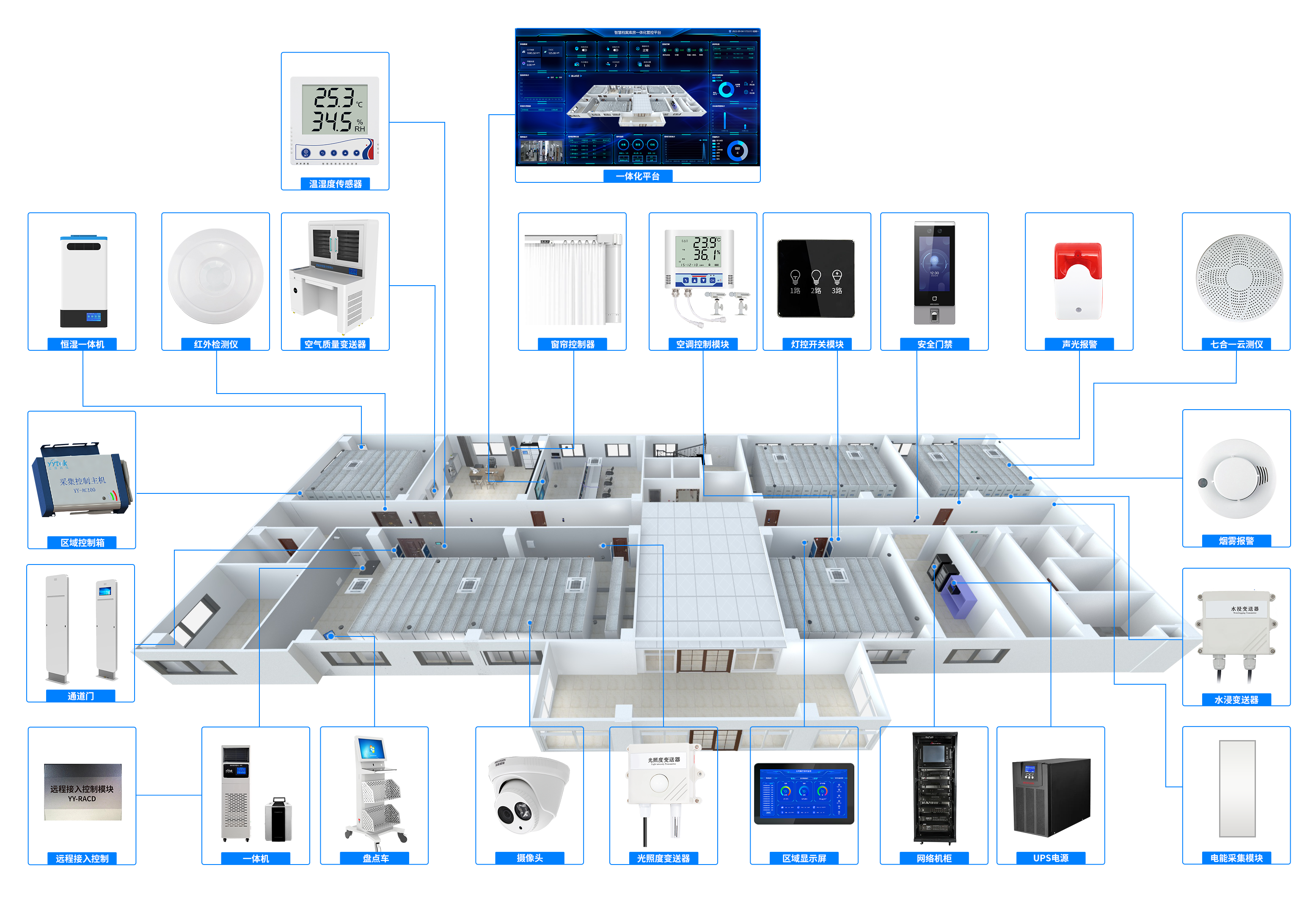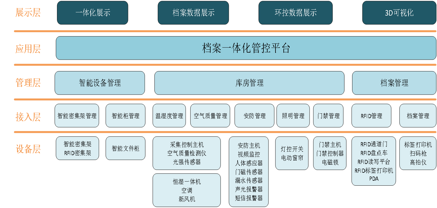 通過一套系統(tǒng)實現庫房內實體檔案管理設備、檔案存儲設備、檔案庫房環(huán)境監(jiān)控設備、檔案庫房安全防范設備等的統(tǒng)一管理。